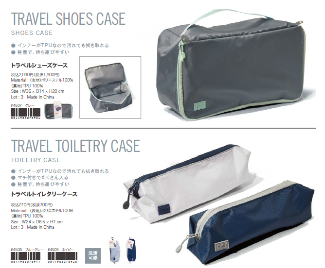 旅行に行く際に小物など収納できるポーチなど幅広くアイテムを取り揃え、