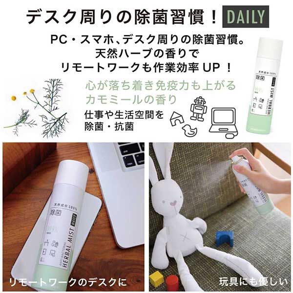 毎日着る衣類や子供のおもちゃ、デスクワークの周りなど、天然ハーブのナチュラルミストで気になるときにシュッと除菌。
