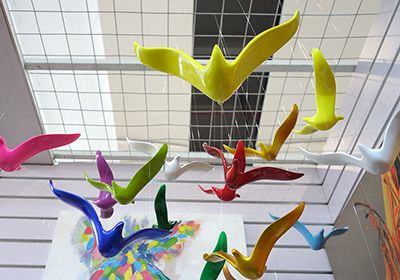 カラフルなカモメたちがお店で優雅に飛び回っています!すごい迫力です!!