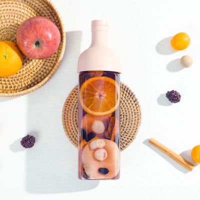 1、ご自宅にあるタンブラーやボトルにお茶パックとドライフルーツを入れます。