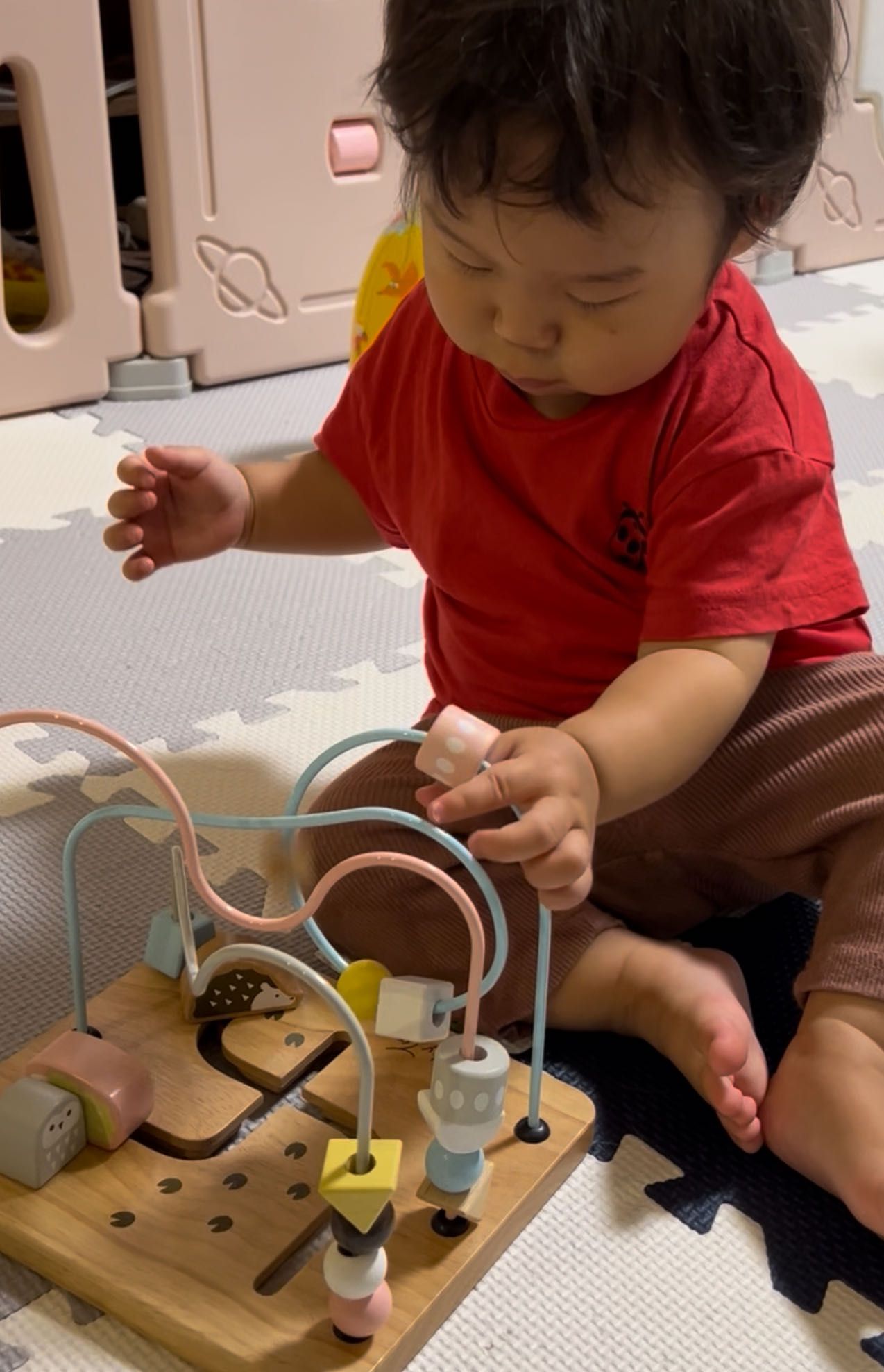ビーズをくるくる回してみたり、動物さん達を動かしてみたり、指先を沢山使って知育遊びができます。