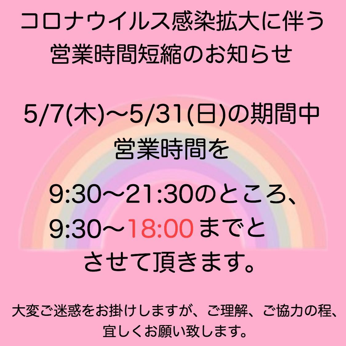 コロナウイルス感染拡大に伴う営業時間短縮のお知らせ