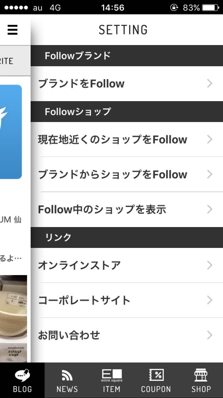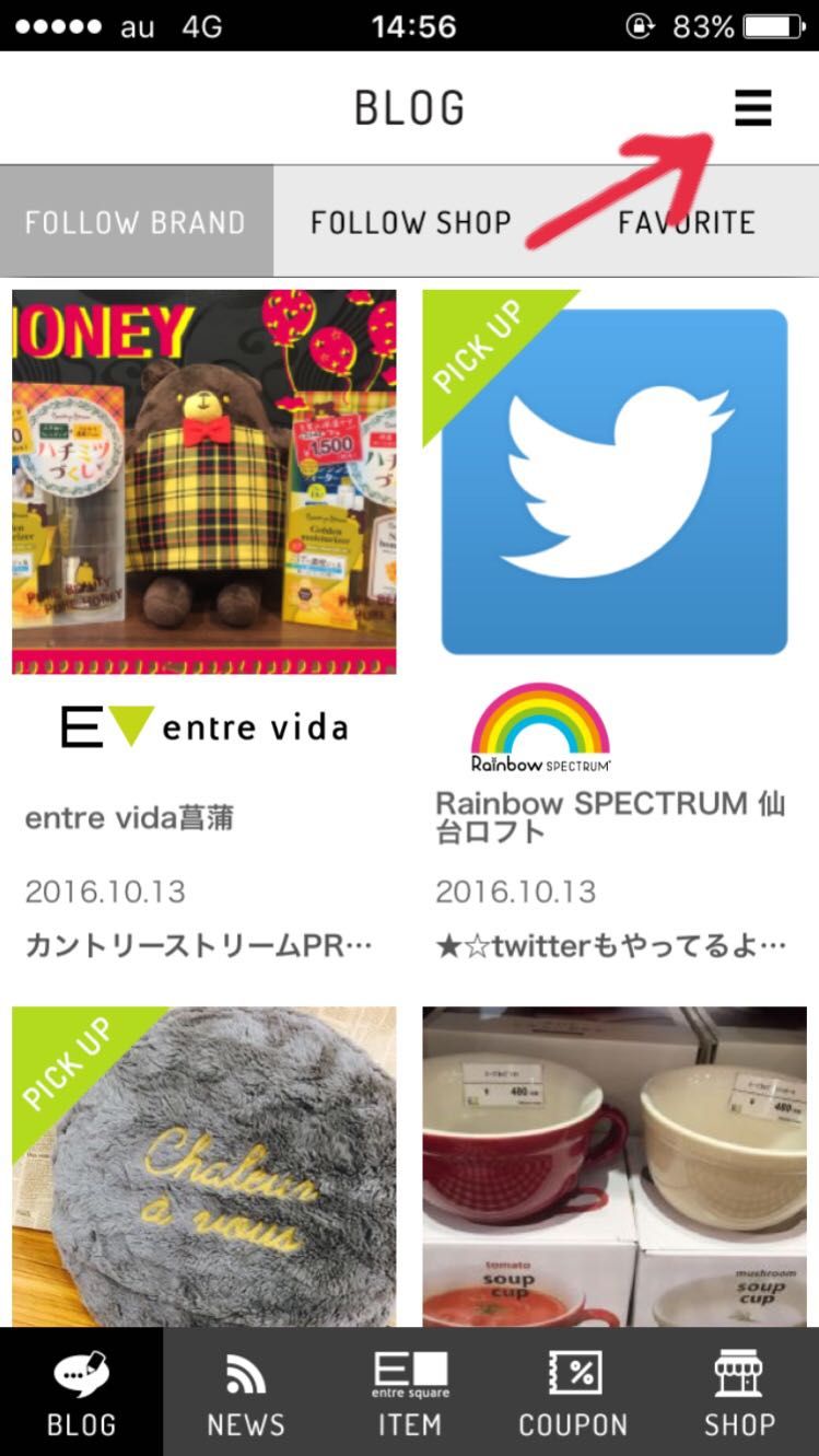 アプリトップ画面の矢印部分をタッチしてメニューを開き、