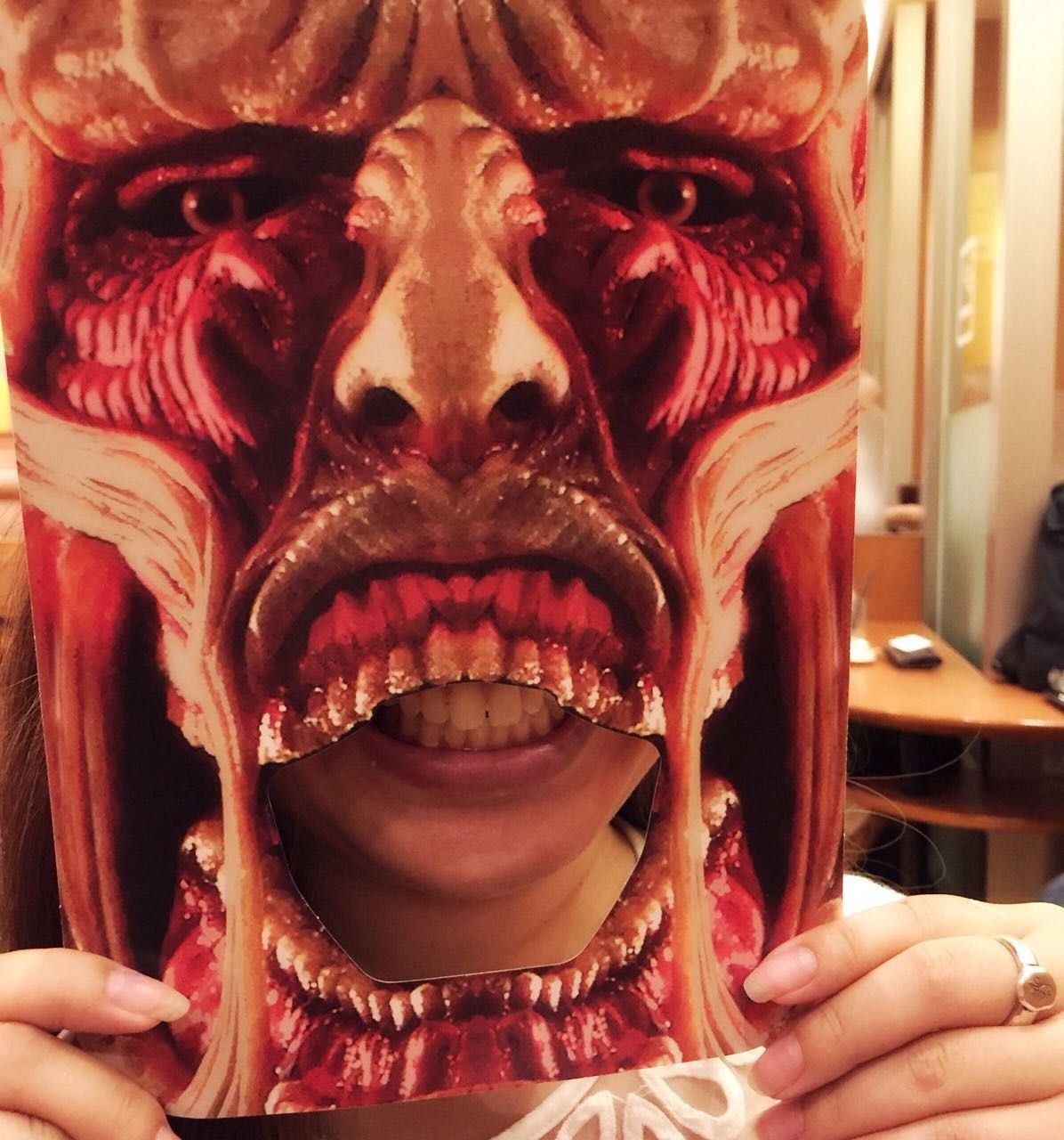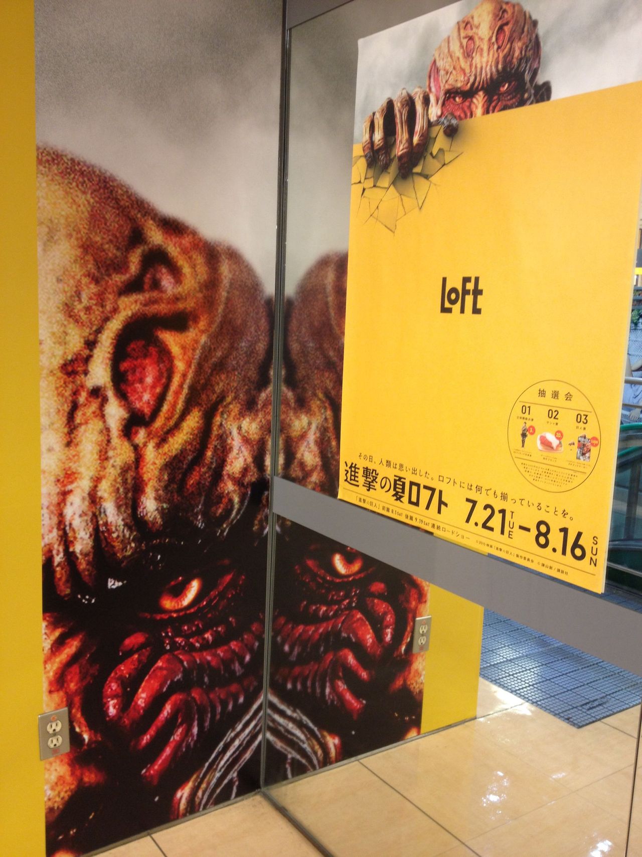 他にも「進撃の巨人」の劇中効果音や特別なナレーションが入った店内放送が流れたり、エレベーターが装飾されたりしています。