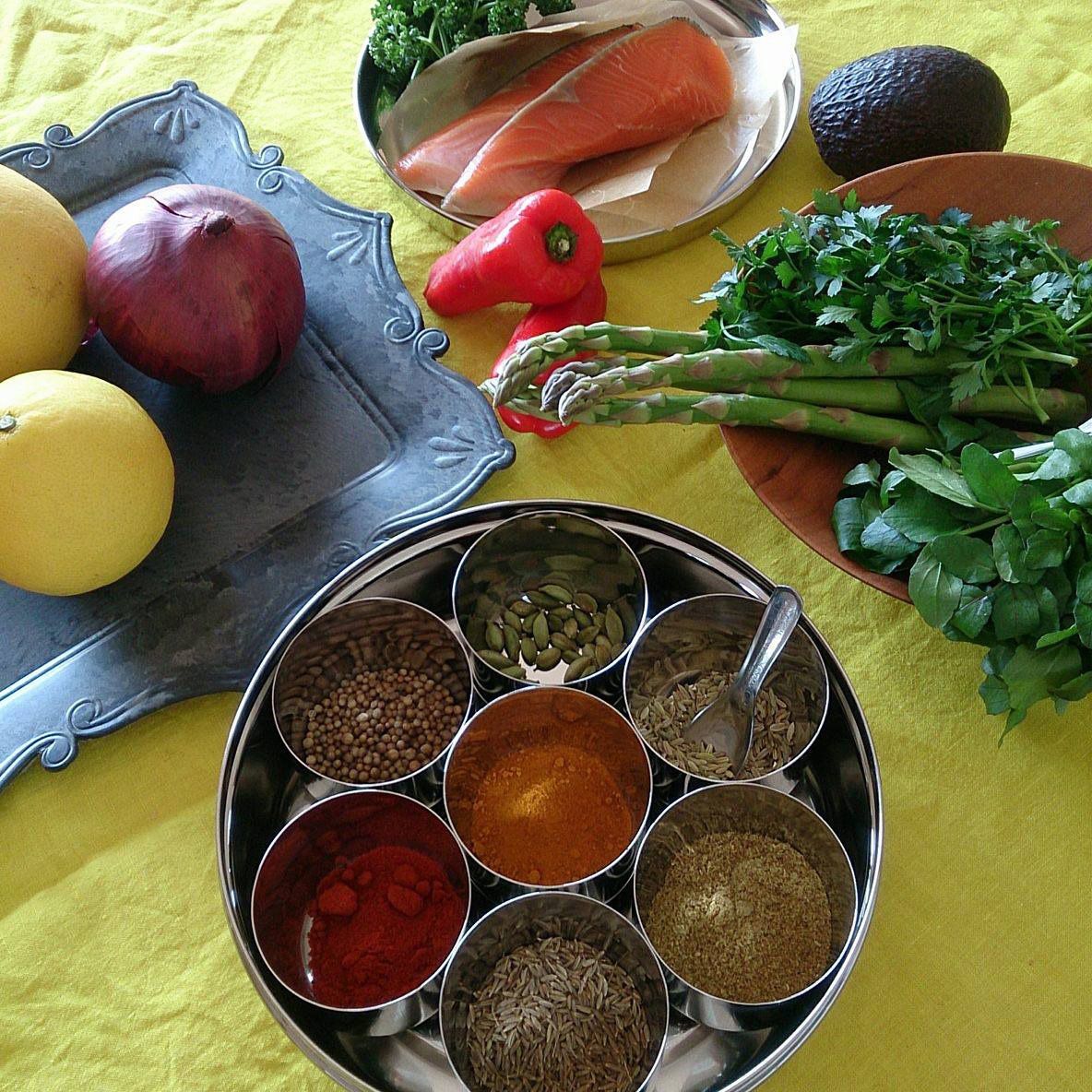 当日のメニューは脳活スムージー、鮭とアスパラのスパイスカレー、柑橘のカチュンバル、チョコミントジェラート、フルーツのスパイスマリネ添えです。(※鮭以外は全て植物性食材使用、グルテンフリー)