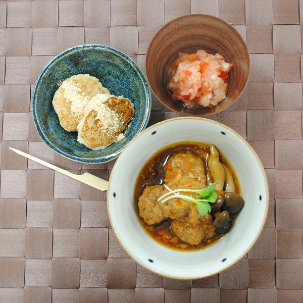 きな粉、れんこんもち、食感のある肉団子、味付けも美味しくいただきました。